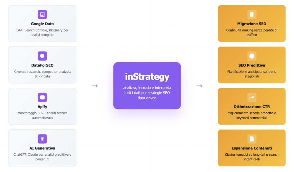 InStrategy aggrega i dati da fonti ufficiali (GA4, GSC, BigQuery), strumenti SEO (DataForSEO, Apify, SerpAPI) e modelli di AI generativa (GPT, Claude)