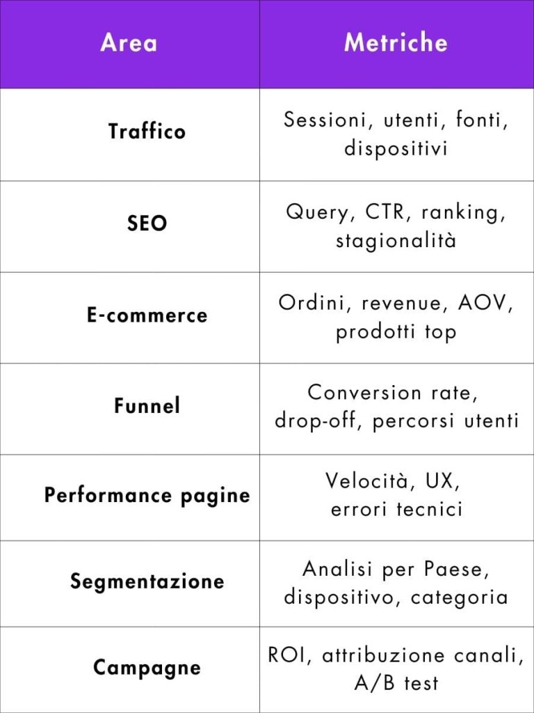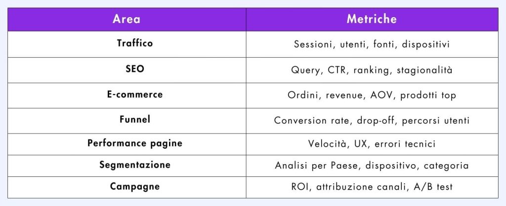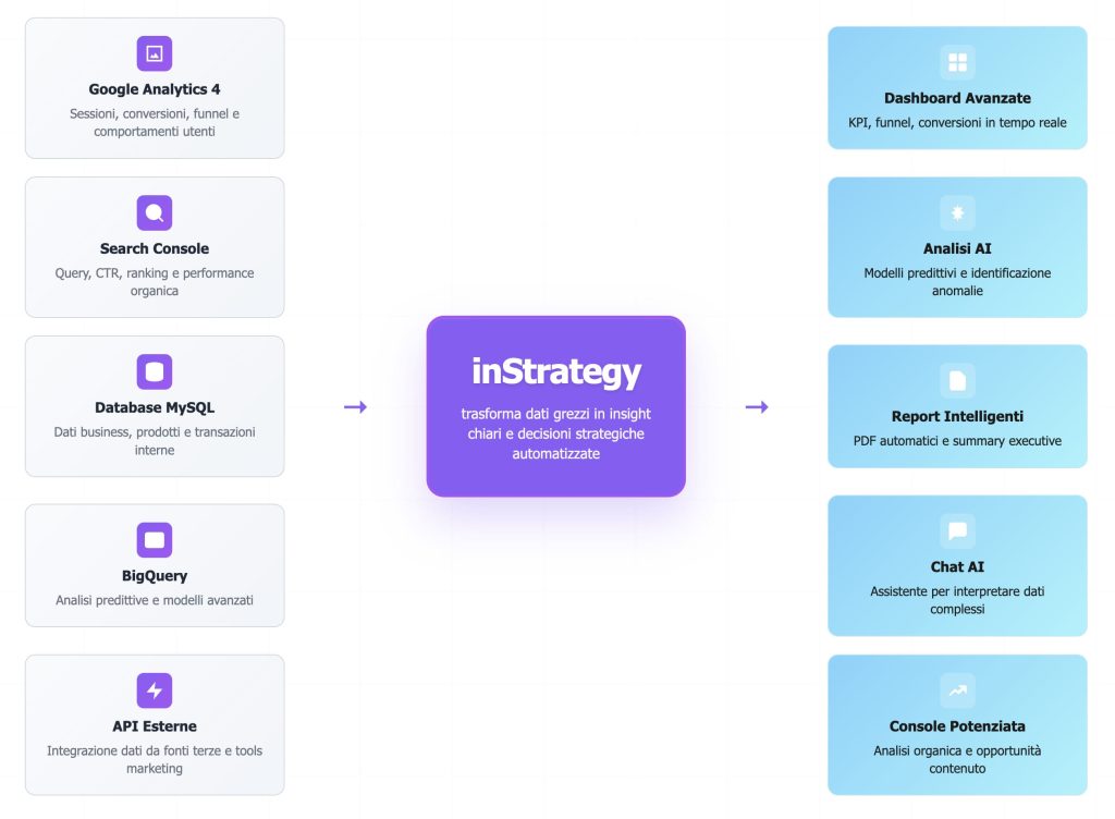 Uniamo tecnologie come GA4, BigQuery, Google Search Console e MySQL a dashboard, AI e automazioni per offrire: